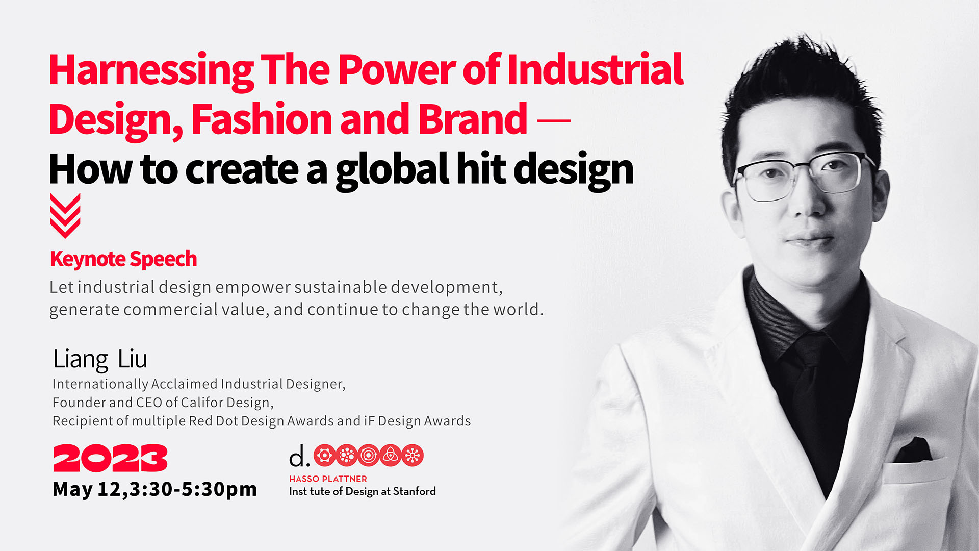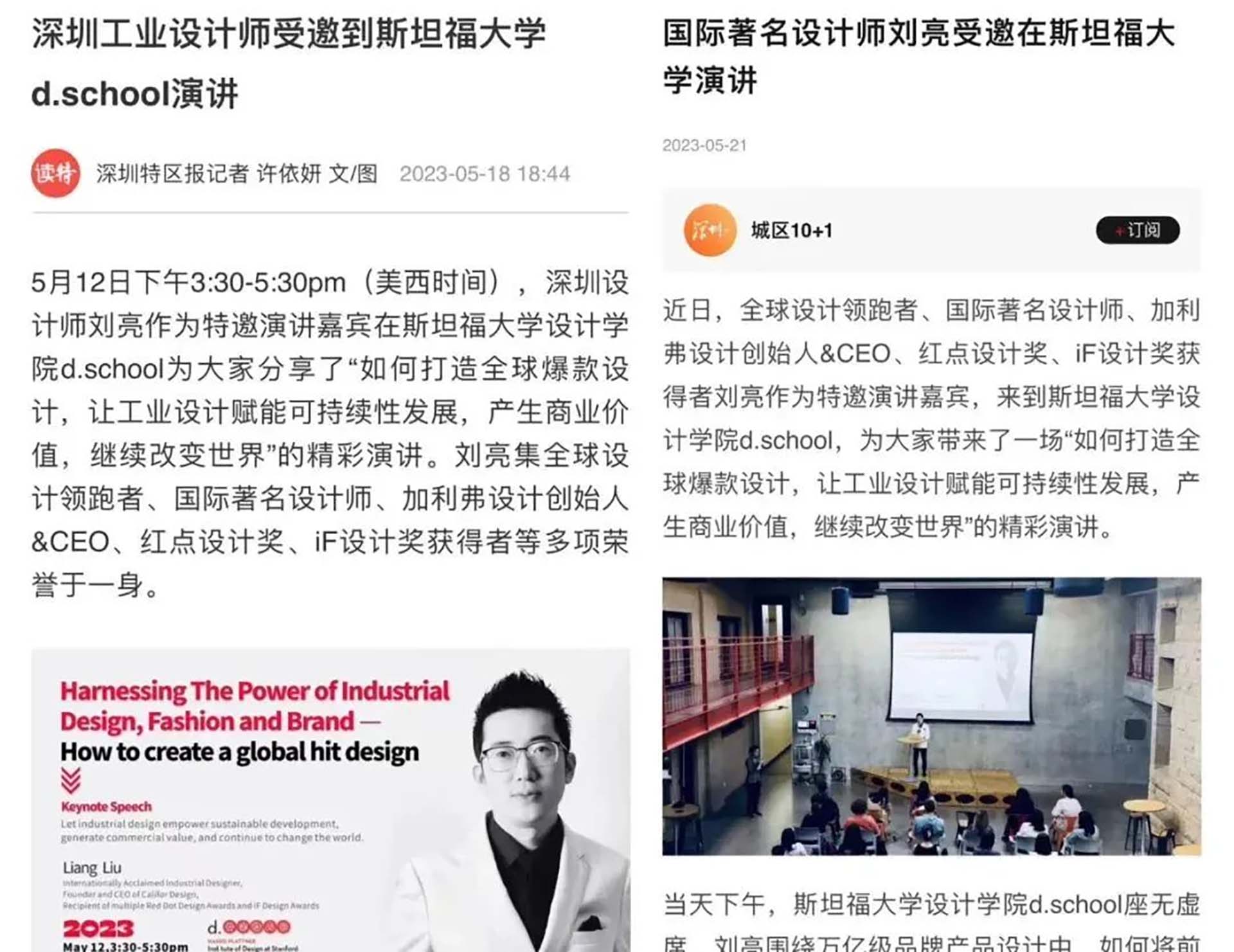 “全球設(shè)計領(lǐng)跑者、國際著名設(shè)計師、加利弗設(shè)計創(chuàng)始人&CEO、紅點設(shè)計獎、iF設(shè)計獎獲得者劉亮作為特邀演講嘉賓在斯坦福大學(xué)設(shè)計學(xué)院d.school,為大家分享了‘如何打造全球爆款設(shè)計,讓工業(yè)設(shè)計賦能可持續(xù)性發(fā)展,產(chǎn)生商業(yè)價值,繼續(xù)改變世界’的演講。”