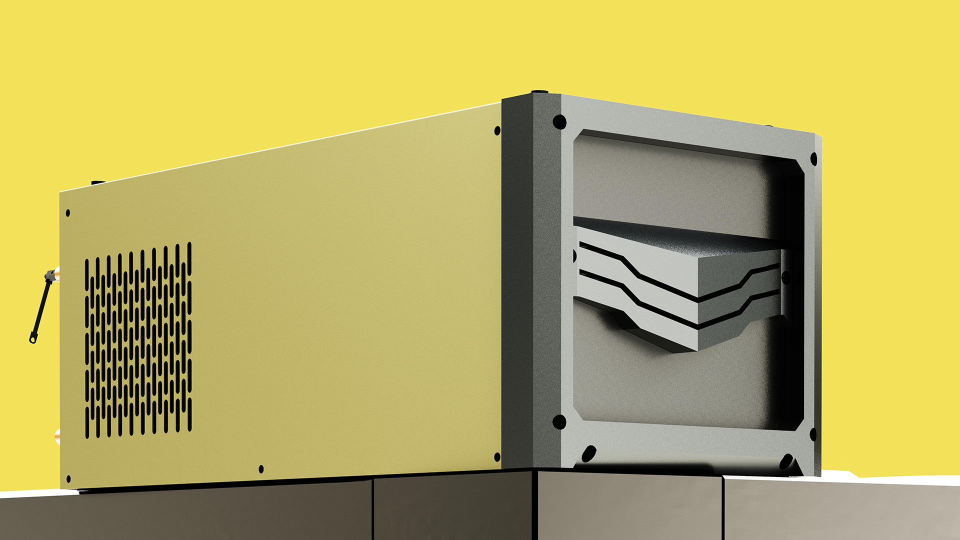 機甲風格電源設(shè)備正面以及側(cè)面搭配散熱孔采用百葉窗式斜向設(shè)計,既解決散熱,又避免了灰塵飛入。操控面板處設(shè)計了透明保護罩,防止火花飛濺燙傷面板,側(cè)面采用飯金設(shè)計,更加堅固耐用。