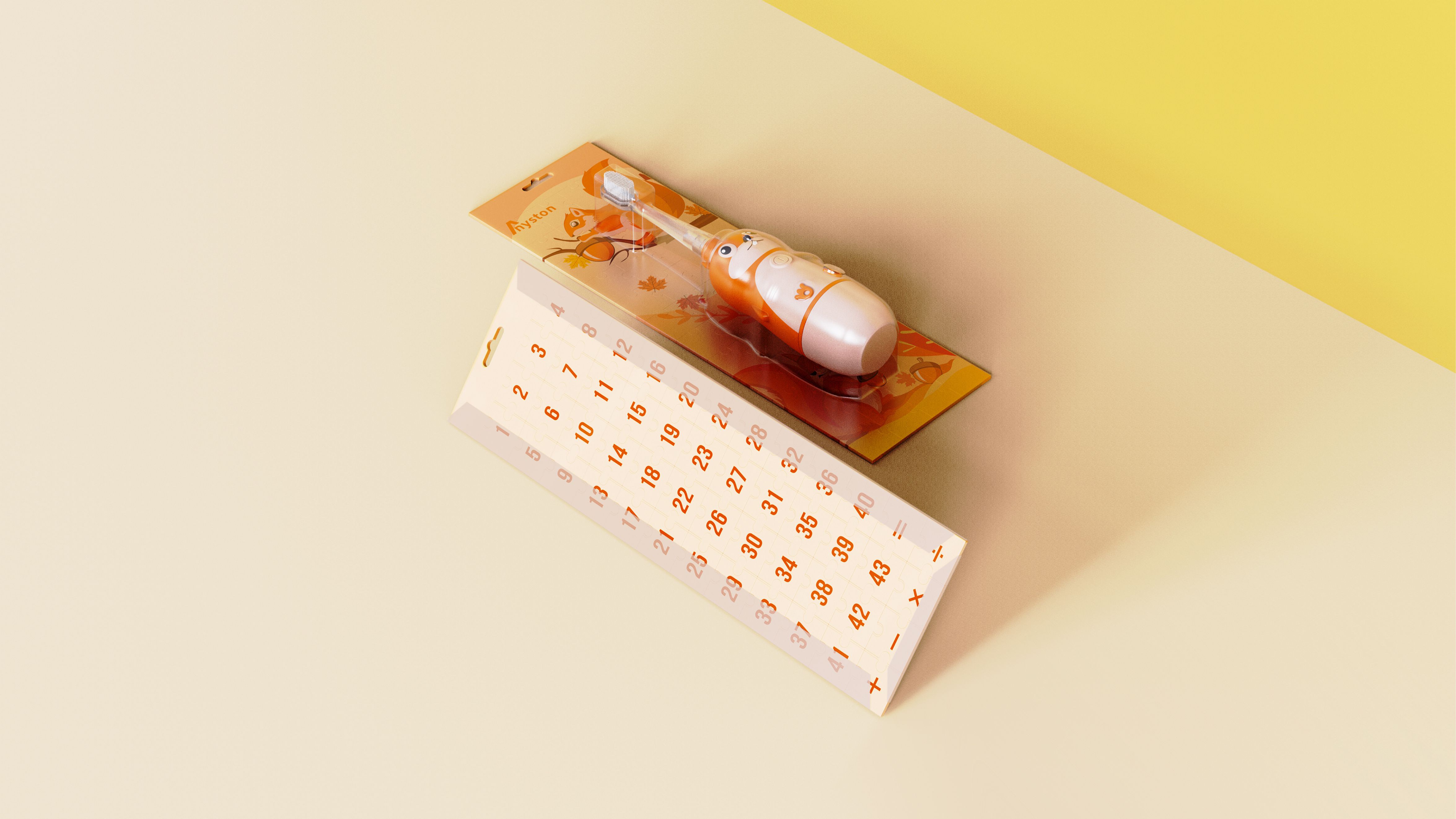 這款兒童牙刷包裝采用長期利用的環(huán)保設(shè)計(jì)理念,牙刷包裝的背板采用插畫風(fēng)格,背板的正面為動(dòng)物主題的卡通圖案,整體設(shè)計(jì)成拼圖形式,用戶在使用產(chǎn)品后,包裝盒可以作為益智類產(chǎn)品給孩子當(dāng)做拼圖玩具使用,避免了浪費(fèi)的問題,背板的背面為數(shù)字以及運(yùn)算符號(hào),在圖拼不上時(shí),數(shù)字可以當(dāng)作拼接順序給予提示,同時(shí)也可以學(xué)習(xí)使用功能。